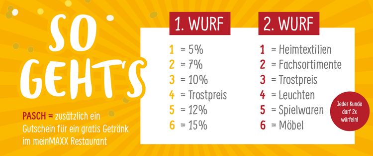 Jeder Kunde darf 2x würfeln und sich so seinen individuellen Preisvorteil sichern. Einfach vorbeikommen, würfeln und mit etwas Glück ordentlich sparen.